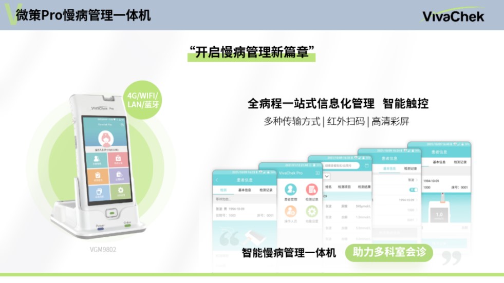 作为青海卫健委推进信息化慢病管理项目的技术支持方,微策生物以微策云、NB-IoT 5G 血糖仪和院内一体机产品形成整体解决方案,将患者端与医生端实时紧密连接,以信息化手段提高慢病管理效率。院内采用操作简便的一体机,方便医护人员快速上手使用;与HIS(医院信息系统Hospital Information System)充分对接,数据回传,减少医护人员誊抄工作量;深度数据分析,可自动生成检测日报,方便各科室协同管理;更有可视化的智慧大屏,患者信息和慢病数据一目了然,方便医院全面监管。